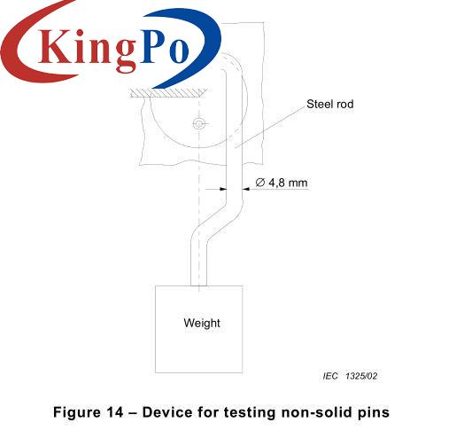 The appliance is checked by the test of IEC60884-1:2022 clause 14.2, figure 17, for pins which are not solid, by the following test which is made after the test of clause 21. A force of 100 N is exerted on the pin, which is supported as shown in IEC60884-1, IEC60884-1, figure 14, for 1 min in a direction perpendicular to the axis of the pin, by means of a steel rod having a diameter of 4,8 mm, the axis of which is also perpendicular to the axis of the pin. During the application of the force, the reduction of the dimension of the pin at the point where the force is applied shall not exceed 0,15 mm. After removal of the rod, the dimensions of the pin shall not have changed by more than 0,06 mm in any direction.